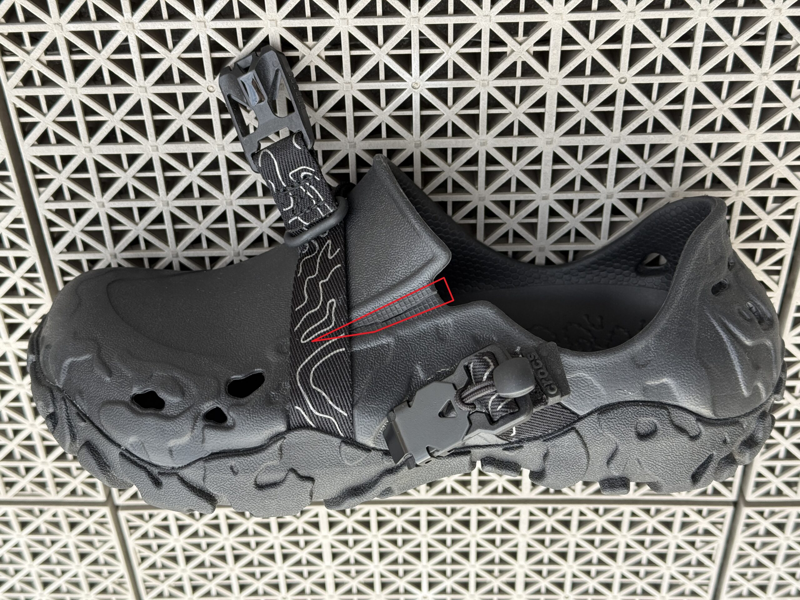 なお、「もっと楽に履けないか?」と写真3の赤線で囲んだ部分に切れ込みを入れてしまってますが、履く時には(長さ調整可能な)ベルトをロックしますので、問題無いと思います。